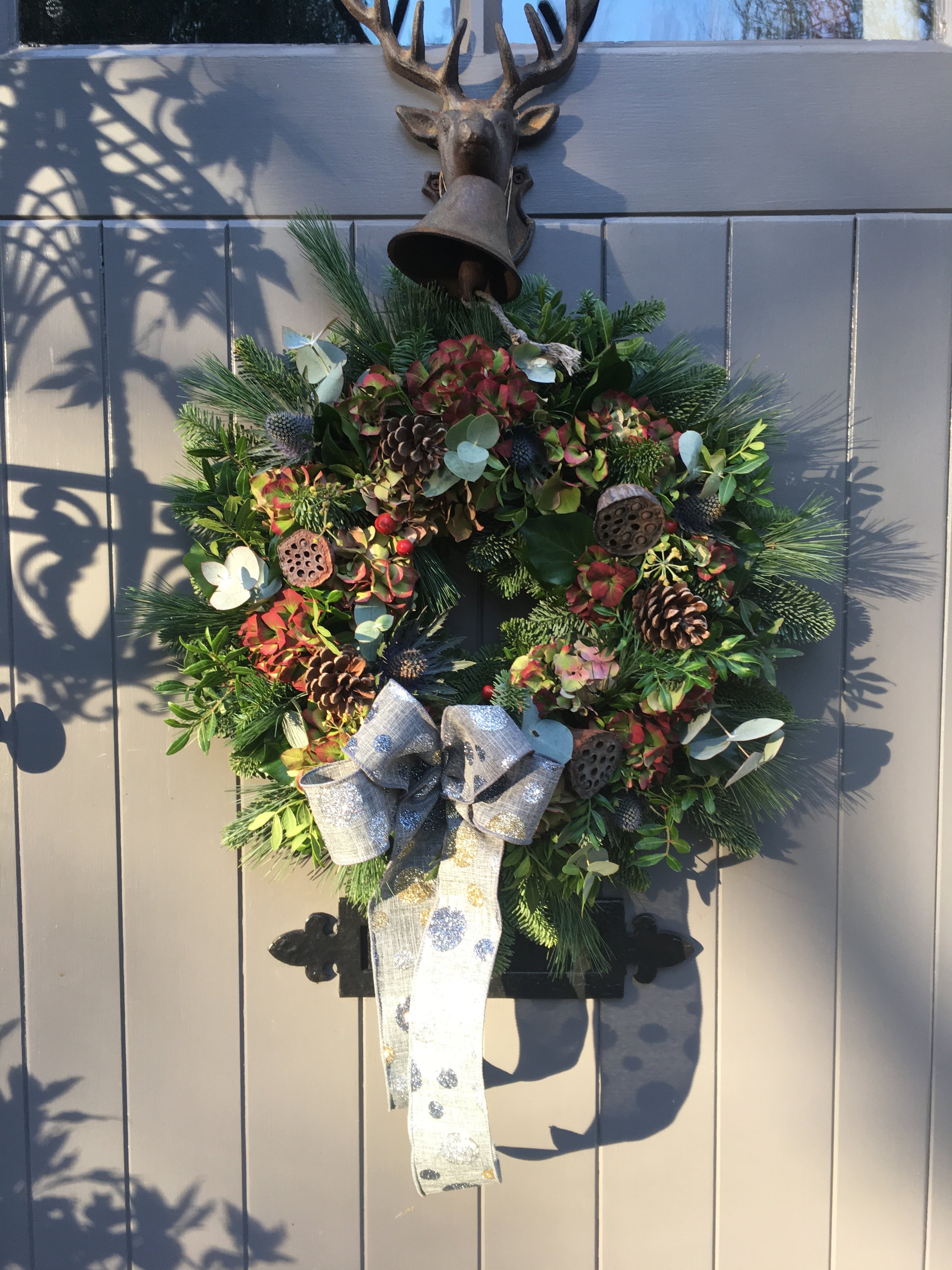 TRADITIONAL - hydrangea (dependant on availability) or skimmia, blue thistle, red hypericum berries and natural decorations like orange slice, pine cones and lotus heads, finished with a luxury ribbon.