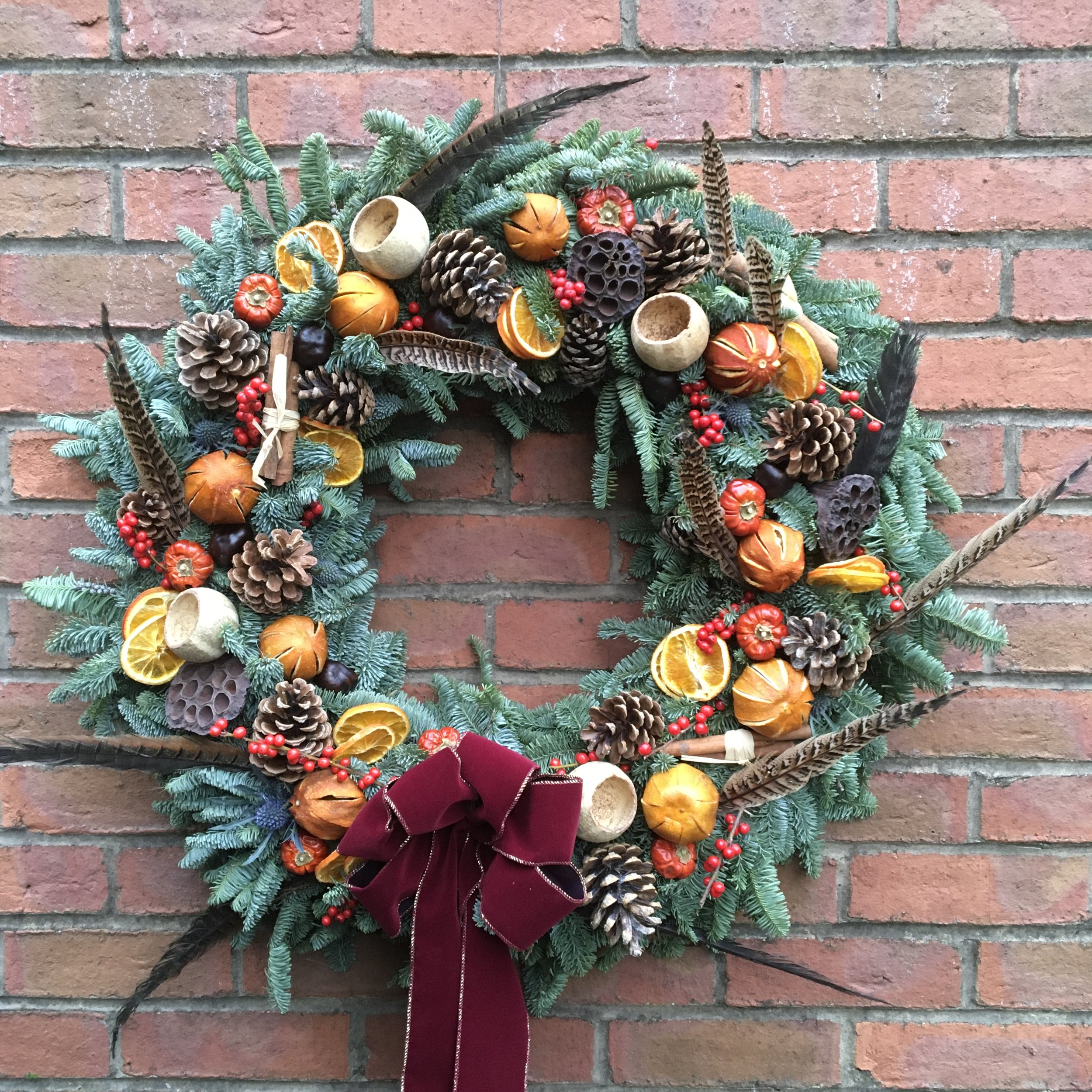 Please note that the photo for the traditional red wreath shows hydrangea, however this may be replaced with red skimmia due to availability. Pheasant feathers were provided by customer in one of the images we do not provide these as standard.